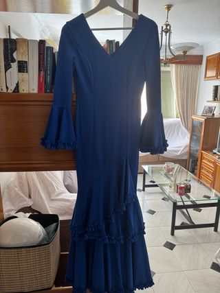 Traje de flamenca de un vibrante color azul. Presenta un diseño elegante con detalles de volantes. - Mangas largas con volantes. - Falda con varios niveles de volantes.