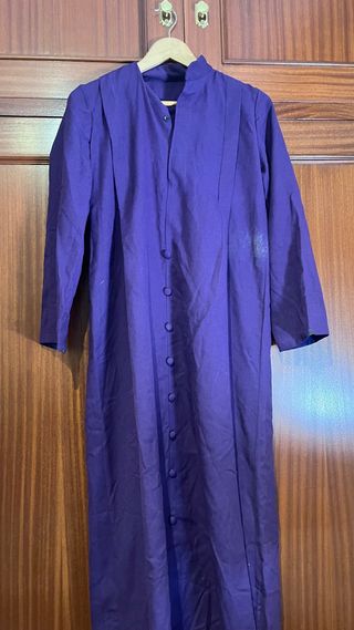 Túnica de penitente con un diseño clásico y elegante. - Color morado intenso. - Diseño de manga larga. - Cuello mao con cierre de botones.