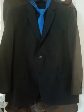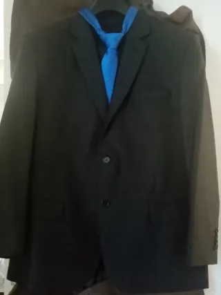Conjunto de traje negro, talla 50 que incluye chaqueta y pantalón, acompañado de una corbata azul, también tengo tirantes azules que los regalo - Chaqueta de traje con dos botones. - Pantalón a juego. - Corbata con diseño de puntos.