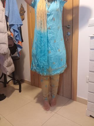 Conjunto de traje tradicional indio. - Parte superior azul con bordados dorados. - Pantalón a juego en tono beige/amarillo. - Chal a juego con degradado de amarillo a azul.