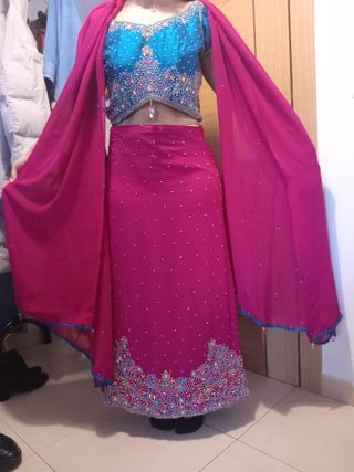 Conjunto de traje tradicional indú. - Parte superior azul bordada. - Falda y chal en color rosa. - Adornado con pedrería.