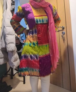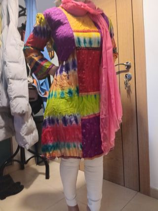 Traje de estilo indú con un diseño vibrante y llamativo. - Diseño patchwork con diferentes estampados. - Mangas largas. - Incluye pañuelo a juego.
