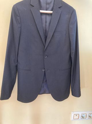 Elegante traje de dos piezas de Zara. Modelo slim fit. En perfecto estado, usado solo en una ocasión. - Chaqueta con solapa de muesca en talla 46. - Cierre de dos botones en la chaqueta. - Dos bolsillos frontales con solapa en la chaqueta. - Pantalón de vestir a juego en talla 40.