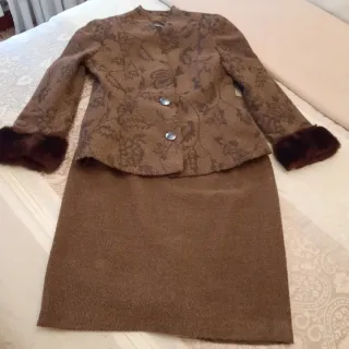 Elegante conjunto de chaqueta y falda en tono marrón. La chaqueta presenta un estampado floral discreto y detalles de piel en los puños. - Chaqueta con estampado floral. - Puños con detalle de piel. - Falda a juego.