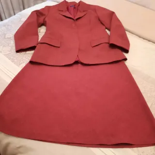 Conjunto de traje sastre en color rojo, compuesto por americana y falda con un cinturón. Casi nuevo. - Americana con cierre de botones. - Falda a juego. - Tejido con textura.