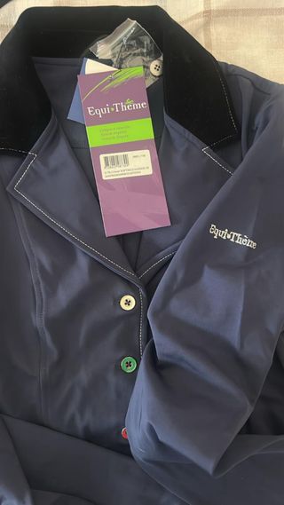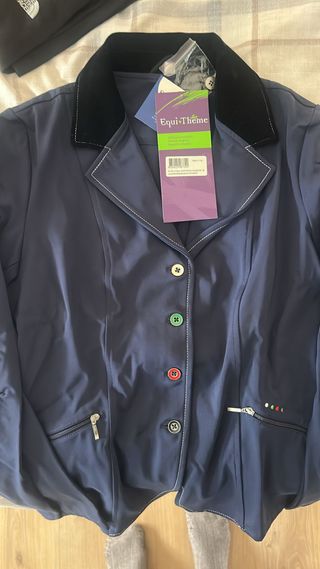 Elegante blazer de equitación, ideal para competiciones o entrenamientos. Presenta un diseño clásico con detalles modernos. - Cuello de terciopelo negro. - Botones de colores en la parte frontal. - Costuras blancas decorativas. - Cremalleras en los bolsillos laterales.