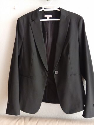 Traje de mujer de color negro. Conjunto de chaqueta, camisa blanca y pantalón. Detalles: Chaqueta: 40(170/92A) Camisa blanca: XS (160/80A) Pantalón: 38 (165/72A) Modelo H,M Prácticamente nuevo. A penas una vez se usó