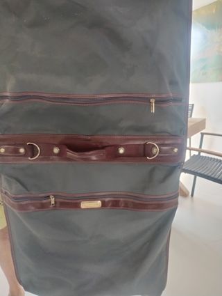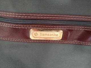 Elegante porta trajes Samsonite de color gris y marrón. Se encuentra en buen estado. - Asa de mano. - Cremallera funcional. - Etiqueta de la marca visible.