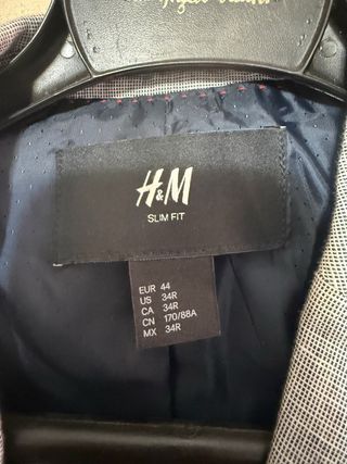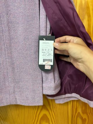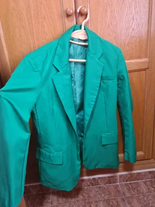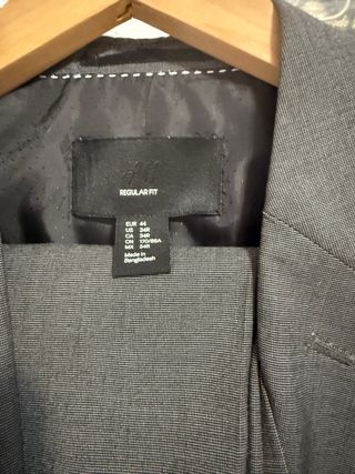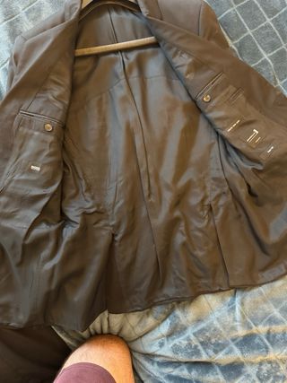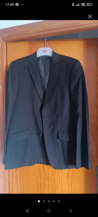 Chaqueta de traje de corte moderno. Nueva, con una puesta. Ideal para ocasiones formales o para darle un toque elegante a tu vestimenta. - Cierre de dos botones. - Bolsillos frontales con solapa. - Pin decorativo en la solapa. - Forro interior ENTREGAS EN PERSONA EN ELCHE Y TORREVIEJA