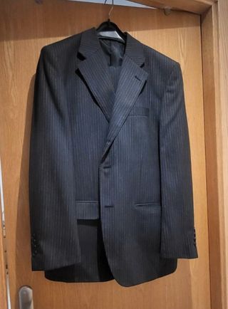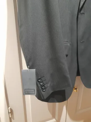 Traje de chaqueta para hombre con un diseño de rayas verticales. Completamente nuevo, solo se ha usado una sola vez - Chaqueta con solapas clásicas. - Cierre de un botón. - Bolsillos frontales con solapa. - Puños con botones.