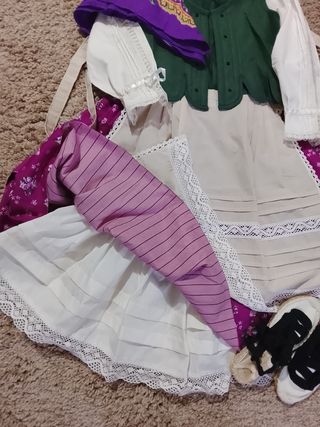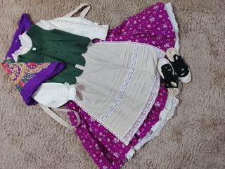 Conjunto de traje regional con falda, blusa, chaleco y pañuelo. - Blusa blanca con mangas abullonadas y puños de encaje. - Chaleco verde con corgon - Falda florecita - Delantal morado con lorzas y encaje - Pañuelo estampado morado y multicolor.