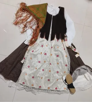 Conjunto de traje regional de niña talla 12 - Pañuelo a elegir - Chaleco marrón. - Falda marrón con estampado a puntos,largo 72 sm - Delantal de seda bordada de flores - enagua con jaretas y bolillos - blusa con puntilla