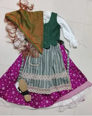 Conjunto de traje regional con detalles bordados y accesorios. - Chaleco verde con botones. - Blusa blanca con encaje. - Falda morada con estampado floral. - Pañuelo con diseño tradicional. - Zapatos a juego.