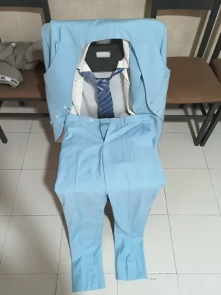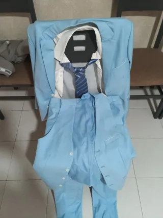 Se alquila o vende chaquet adulto talla L chaquet niňo7 aňos igual que el de adulto Trajes comunión o evento niňos 3 y 10 aňos Conjunto de traje para niño en tonos azul y blanco. - Chaqueta con detalles. - Chaleco a juego. - Camisa blanca. - Corbata. - Pantalón.