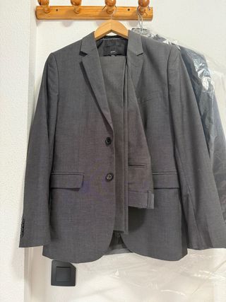 Traje de dos piezas en color gris ceniza. - Chaqueta con dos botones. - Pantalón a juego. - Diseño moderno y elegante.