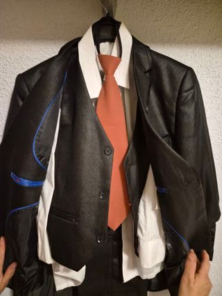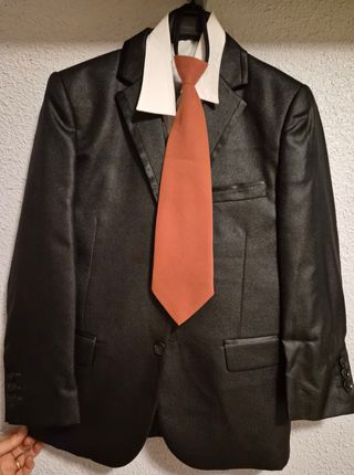 Conjunto de traje para niño, ideal para eventos especiales. Incluye chaqueta, camisa y corbata. - Chaqueta de color negro con acabado brillante. - Camisa blanca. - Corbata de color naranja. (30€ cada uno)