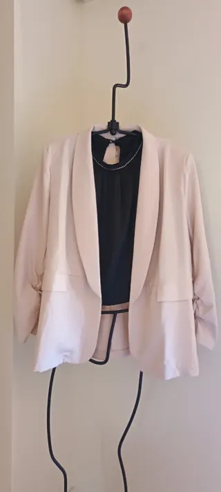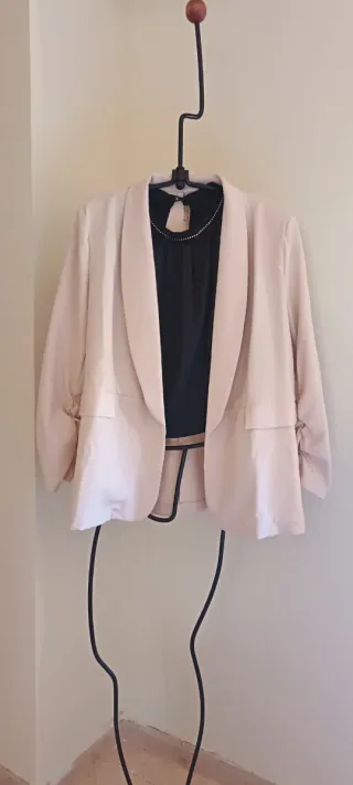Blazer de color beige con un diseño moderno y elegante. Ideal para complementar cualquier atuendo. - Solapa ancha. - Mangas con detalle fruncido. Opcional si se quiere la blusita negra. Artesanal y única. Está puesta a parte también en mi perfil. Las dos cosas 15€. Por separado 20€, 10€ cada prenda.