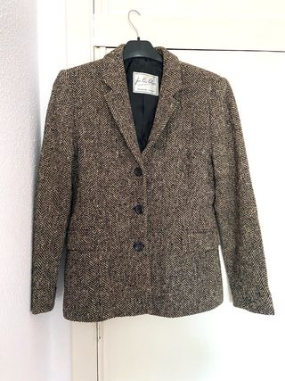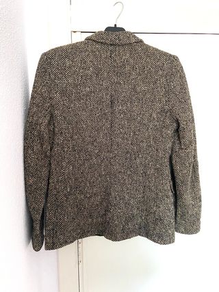 Elegante traje de chaqueta con un diseño de espiga clásico. - Chaqueta talla L largo 63 cm pecho 46 cm - Pantalon con forro, talla M cintura 36 cm largo 102 cm