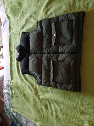Chaleco acolchado con cremallera frontal y bolsillos. - Dos bolsillos en la parte delantera con cierre de botón. - Cuello alto negro.