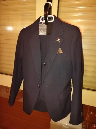 Elegante traje de hombre con corte slim fit, perfecto para ocasiones especiales. Totalmente nuevo sin usar, se vende por tallaje equivocado. Cuenta con pañuelo y broche. COLOR AZUL OSCURO Hago envíos. -Pantalón - Chaqueta de un botón. - Chaleco a juego. - Solapa de muesca.