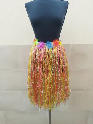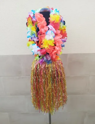 Un conjunto de disfraz hawaiano que incluye una falda hula de paja multicolor con cinturón de flores y un 4 collares de flores (lei). Ideal para una fiesta de disfraces o carnaval. Precio por todo.
