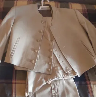 Se vende traje completo infantil de gala, ideal para ceremonias, actos oficiales, comuniones especiales, teatro o coleccionismo. Incluye: • Chaqueta azul marino con doble botonadura • Distintivos bordados y galones • Cordón dorado ceremonial • Camisa blanca • Chaleco • Pantalón a juego Marca: KIDDY Talla: 10 Estado: Muy bueno, bien conservado, sin rotos ni desperfectos relevantes (ver fotos). Conjunto elegante y difícil de encontrar, con acabados de calidad. Entrega en mano o envío a cargo del comprador.