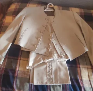 Bonito traje de corto campero de la prestigiosa marca española artesanía Jiménez. Traje beige compuesto por chaqueta talla 54 , chaleco 52 y pantalon o calzona talla 44. Solamente una puesta de horas en una romería. Se regala sombrero ala ancha negro marca iberica sevilla talla 58 y pañuelo granate estampado. Traje campero . Traje de corto . Traje de curro . Traje rociero . Traje cordobes . Traje sevillano . Traje andaluz . Traje flamenco . Traje amazona . Traje jinete . Traje jimenez. Traje tomar . Artesanía Jimenez . Rocío . Romería . Feria de abril . Caballista . Campero . Campo . Torero . Montar a caballo