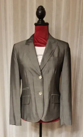 Elegante traje de chaqueta gris de la marca Yera, mezcla de lana y seda - Diseño clásico y versátil. - Dos bolsillos frontales con solapa. - Cuello solapa. - mezcla lana y seda. Sólo venta en pedido mínimo de 60€