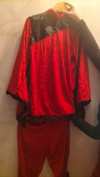 Disfraz de ninja completo, ideal para fiestas o eventos. Hay uno talla S y otro talla M. Precio por unidad. - Conjunto de dos piezas. - Diseño con detalles ornamentales.
