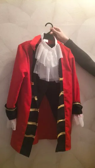 Disfraz de Capitán Garfio con detalles dorados y rojos. - Talla XS (34/6). - Incluye chaqueta, jabot y pantalón. - Mangas con puños blancos. - Adornos dorados en la chaqueta.