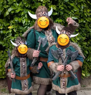 Disfraz unisex inspirado en vikingos, apto para adultos y/o niños. Disponibles dos disfraces de adulto de la talla XL por 22 euros cada uno. Disponibles dos disfraces de niñ@, uno de la talla 8-10 años y otro de la talla 6-8 años por 20 euros cada uno. Si se compran los 4, los dejo a 70 euros. Usados solo para salir en la comparsa. Incluye vestido, capa de pelo, cinturon, muñequeras y tobilleras de pelo, y cinta de tela con cuernos para la cabez. Uno de los de adulto, tiene la tira de decoracion del medio algo torcida, son muchos disfraces hechos por encargo y a batalla, por lo que siempre hay alguno que tiene algun pequeño defecto