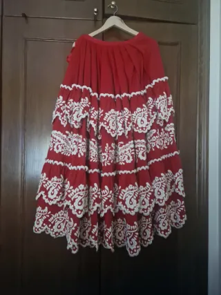 Precioso refajo de huertana con dos volante. Regalo a mi hija y ya no se viste por vivir fuera. Rojo tradicional bordado con lana beige. Para alguna peña o coros y danzas. Tiene dos puestas. Forrado entero. No hago envios. En las fotos está la factura. Si estás interesado-a,algunas veces bajo a murcia. Es un un refajo garantizado