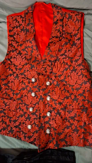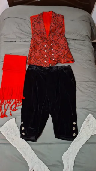 Conjunto de traje de huertano típico de Murcia. Chaleco estampado talla L-XL, adaptable, con botones en plata de calidad. Pantalón terciopelo con botones plateados talla 56 Fajín Medias 41-43 De vende entero a 120 euros... Con posible rebaja