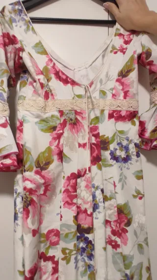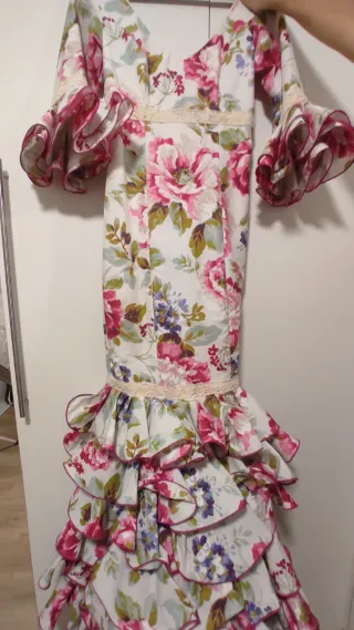 Traje de flamenca( cintura 70cm, cadera 90cm) con un bonito estampado floral. Presenta volantes en las mangas y en la falda, con detalles de encaje en la cintura. - Diseño con estampado de flores. - Mangas acampanadas con volantes. - Falda con múltiples volantes. - Adorno de encaje en la cintura.