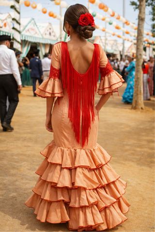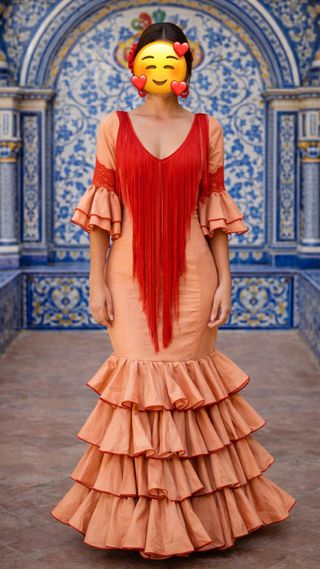 Traje de flamenca con un diseño elegante y detalles de volantes. - Cuerpo ajustado con escote en V. - Mangas largas. - Falda con múltiples volantes escalonados.totalmente elástico etre la 40 a la 42