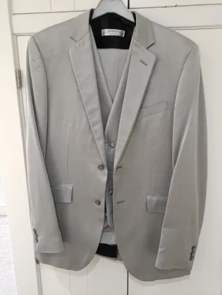 Traje de tres piezas de la marca CLIPPING Ceremonia. Medidas americana : 46 cm hombro y 76 cm largo Medidas pantalón : 43 cm cintura - Chaqueta con un botón. - Chaleco. - Pantalón.