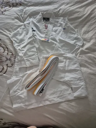 Traje de Taekwondo para niño de la marca Daedo. - Traje de karate blanco. - Incluye cinturón blanco y amarillo.