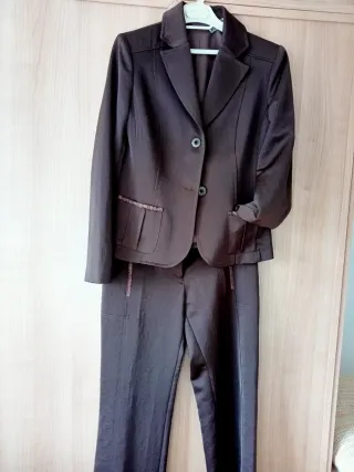 Elegante traje de dos piezas en tono marrón chocolate. - Chaqueta con solapas y cierre de botón. - Pantalón de corte recto. - Detalle de vivo brillante en bolsillos y cintura