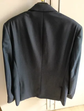 Traje de corte slim fit en color azul marino. Usado una vez, como nuevo. Chaqueta con solapa de muesca. Talla 52. - Cierre de dos botones. - Bolsillos de solapa. - Puño con botones. Pantalón a juego talla 42.