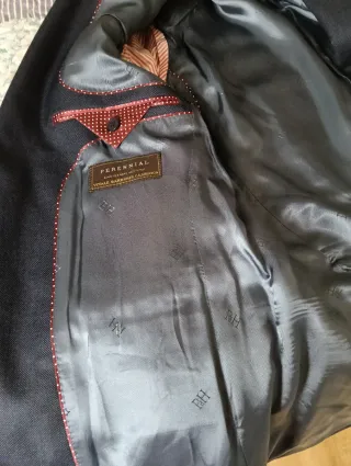 Elegante traje de dos piezas en color azul marino. Presenta un corte Slim ajustado moderno. - Chaqueta con solapa de muesca. - Cierre de un botón en la chaqueta. - Bolsillos interiores todavía sin abrir. - Puño de la chaqueta con tres botones. - Forro interior a rayas. - Bolsillo efecto pañuelo blanco Usado 1 sola vez para un evento. Me lo compré hace 5 años para una boda y ya no me vale. Me costo 120€ ...