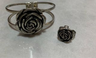 Conjunto de bisutería con diseño de rosa. - Pulsera con diseño abierto. - Anillo ajustable con motivo de rosa.