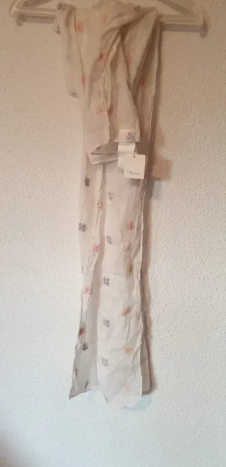 Pañuelo fino con un delicado estampado de flores bordadas a lo largo de la tela. - Diseño floral. - Acabado con flecos en los extremos.