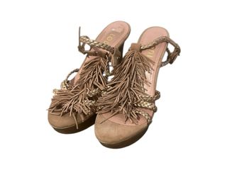 Elegantes sandalias de tacón con un diseño bohemio y detalles dorados. - Adorno de flecos en la pala. - Tiras trenzadas. - Cierre de hebilla.