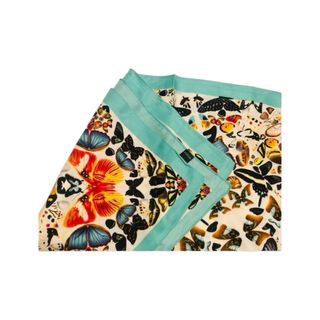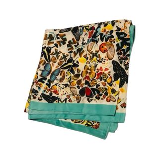 Elegante pañuelo de seda con un vibrante estampado de mariposas. - Material: 100% seda. - Diseño: Estampado de mariposas en múltiples colores. - Acabado: Bordes con ribete en color turquesa. Valorado en 100€