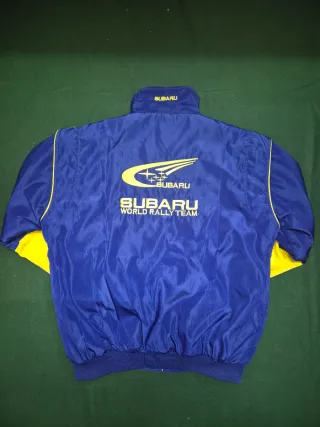 Chaqueta deportiva con diseño inspirado en el Subaru World Rally Team. - Color azul y amarillo. - Logo de Subaru y patrocinadores. - Cuello alto y puños elásticos. - En muy buen estado. - Talla M.