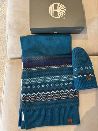 Conjunto de bufanda y gorro de punto con un diseño jacquard. - Bufanda y gorro a juego. - Tejido de punto con patrón geométrico. - Detalle de etiqueta de marca. Está en su caja original, completamente nuevo, sin estrenar. Comprado en El Corte Inglés.