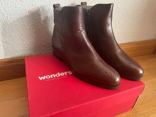 Botines de piel para mujer de la marca Wonders. Nuevas a estrenar. - Talla 38. - Color marrón. - Diseño con picado en la punta. - Cierre de cremallera lateral. - Fabricados en España
