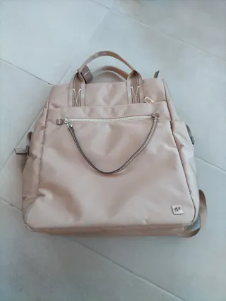 Bolso tipo mochila en tono beige y marrón. Un accesorio versátil y práctico. Medias 34cm alto, 28cm ancho, 10cm fondo - Material resistente. - Cierre de cremallera. - Asas superiores y correas para llevar como mochila, que se pueden guardar y no se ven Varios bolsillos interiores