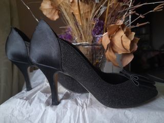 Elegantes zapatos de tacón alto con un detalle de lazo. Plantilla de cuero y forro de tela. Laterales con tela brillante negra efecto purpurina. Tiene la suela con señales de uso pero nunca me los he puesto en la calle, sólo ha sido de probármelos.