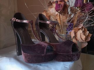 Elegantes zapatos de tacón alto con plataforma color borgoña. - Material aterciopelado. - Tira al tobillo con cierre de hebilla. - Detalle de purpurina en las tiras, tacón y parte posterior. - Puntera y plataforma de terciopelo. Marcas de uso de hacérmelos probado en casa.